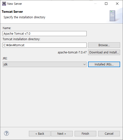 톰켓 압축을 풀어 놓은 경로를 설정. 그리고 Finish